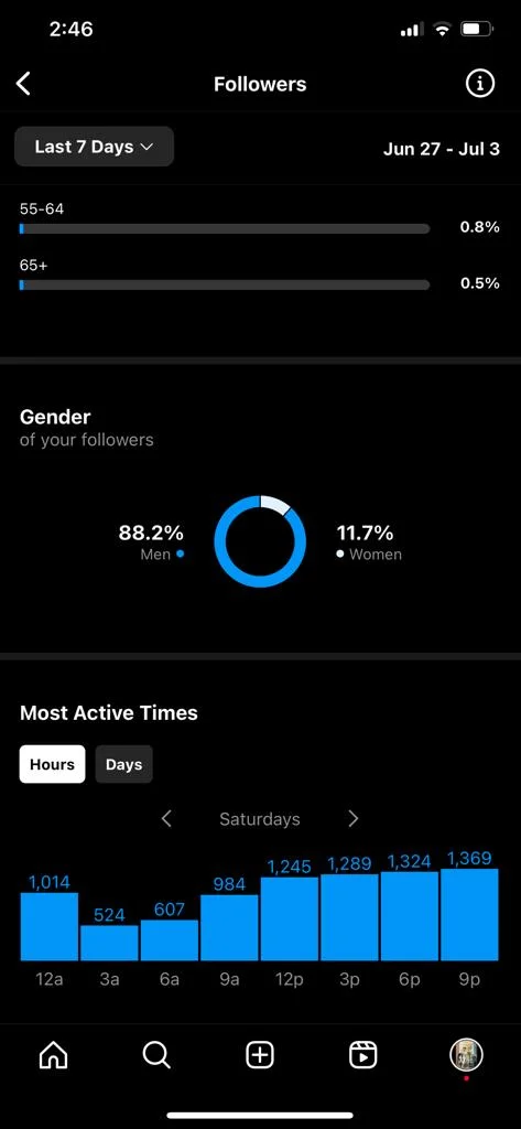 Instagram insights also shows the %percentage of Men and Women following us, It also tells us what was our followers growth rate in past 7-days was it (-) or (+), you can easily keep a track of each day Most Active time which tells us which hour of the day was our audience most interacting with our content and the Gender graph help us to know is our content manly or is it a girly content, knowing this we can work on our weaker side so that our content must me liked by everyone.
